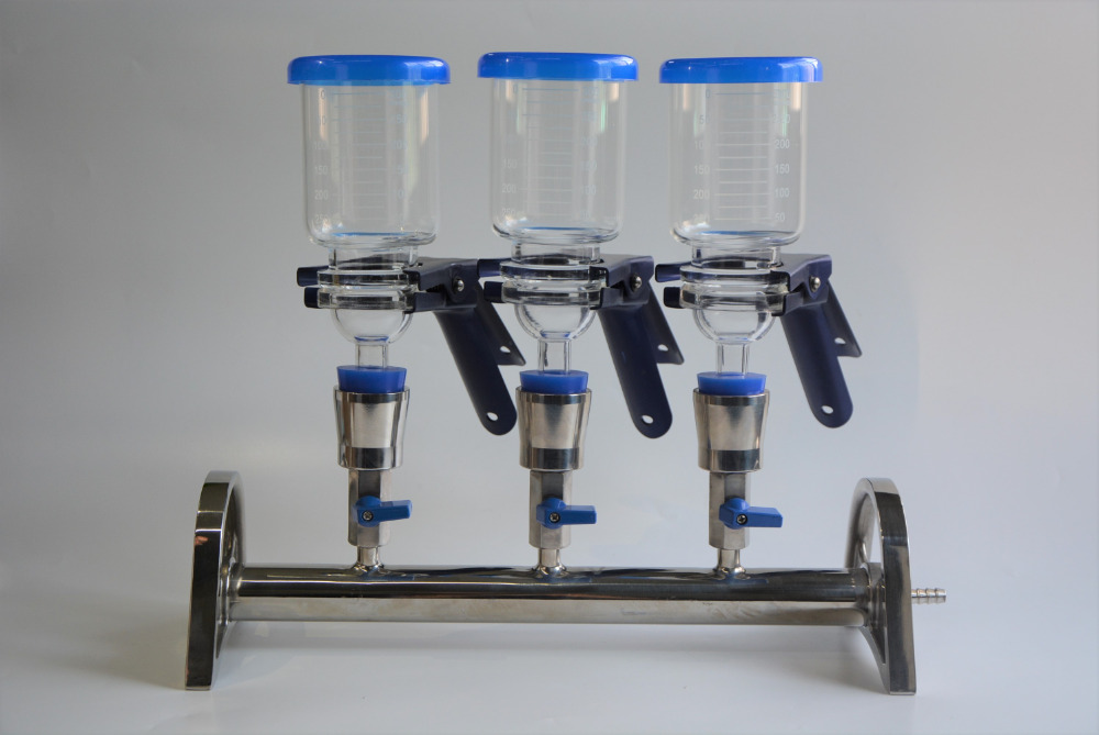 MS三聯(lián)過濾器由三個溶劑過濾器串聯(lián)而成、一次可同時過濾多個樣品。每個過濾孔均可獨(dú)立控制,可連接多種類型的漏斗,可蒸汽滅菌。標(biāo)準(zhǔn)多聯(lián)過濾器支架采用不銹鋼材質(zhì),換膜過濾器為特硬玻璃。三聯(lián)多聯(lián)過濾器使用時,只需一個真空泵,即可同時過濾多達(dá)多個樣品,過濾支架每個支座都備有獨(dú)立的控制閥門,具有安裝簡便、易消毒,提高平行實(shí)驗(yàn)準(zhǔn)確度,減少重復(fù)性過濾試驗(yàn)次數(shù)等特點(diǎn)。
