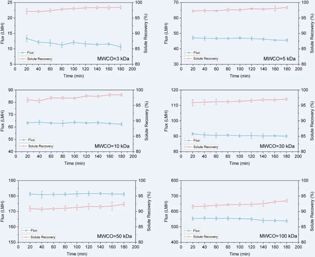 下面是我們配置了四種不同濃度的蛋白溶液包括蛋清蛋白, 0.25mg/mL (14,000MW)、卵清蛋白, 1.0mg/mL (42,000MW)、牛血清蛋白, 1.0mg/mL (66,000MW)、γ球蛋白, 1.0mg/mL (150,000MW)等,用我們不同分子截留的單模塊和三模塊的PRISM 50超濾膜包進行截留,實驗條件在3 bar進口壓力,20℃下濃縮20倍,其平均直接回收率在94%以上,在10mL沖洗的條件下平均回收率達到98%以上,其過程對純水的通量總體恢復非常穩定,沒有明顯的下降趨勢。