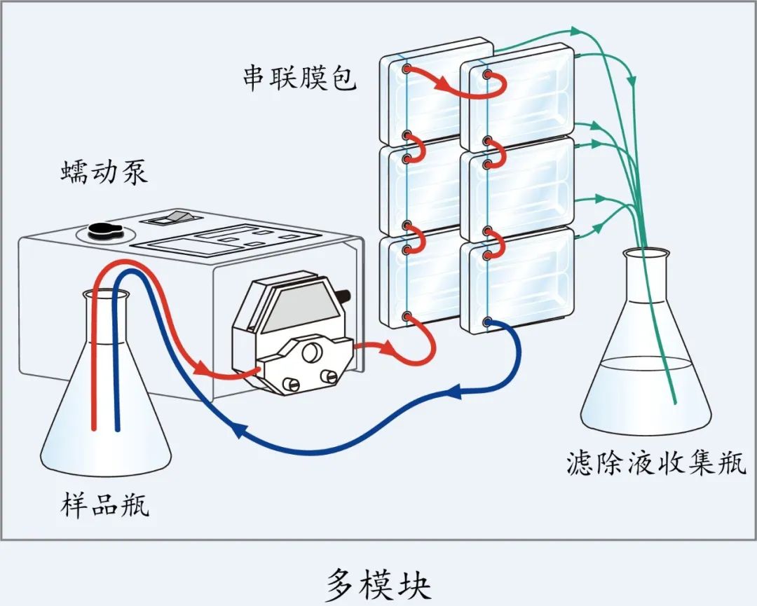 PRISM 50的模塊化設計使多個模塊串聯操作。這將最大吞吐量提高到3升,并與膜面積成比例地加快處理速度(見下圖)。